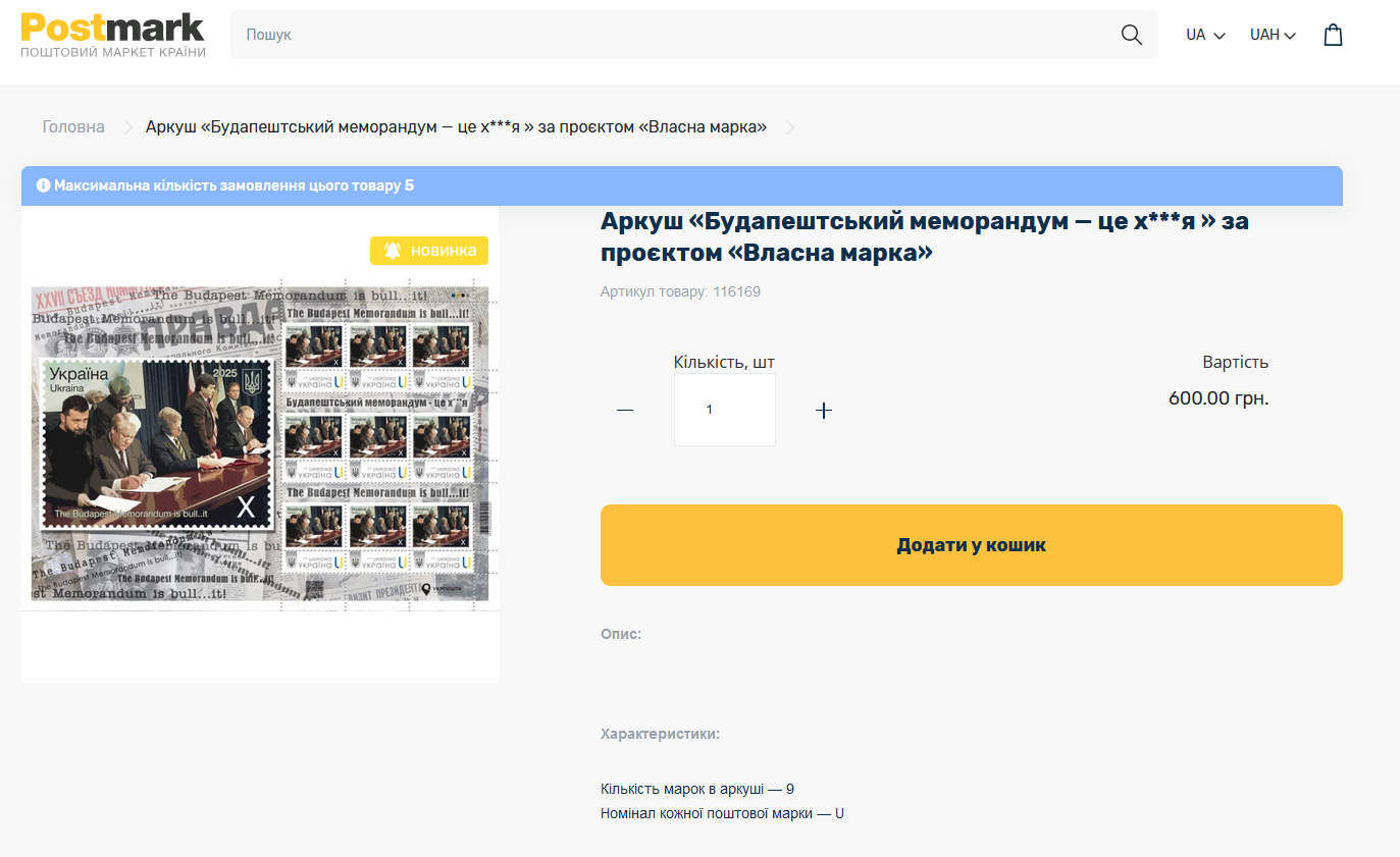 Национальный оператор почтовой связи "Укрпочта" не выпускал официальную серию марок "Будапештский меморандум - это х...я", а запустил производство под заказ.