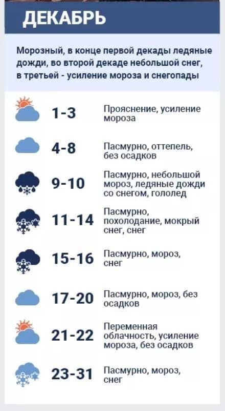 Начиная со второй половины декабря, Горбань предсказывал более-менее устойчивый мороз и снег. При этом осадки до 22 декабря должны прекратиться, но температура воздуха постепенно должна падать все ниже.
