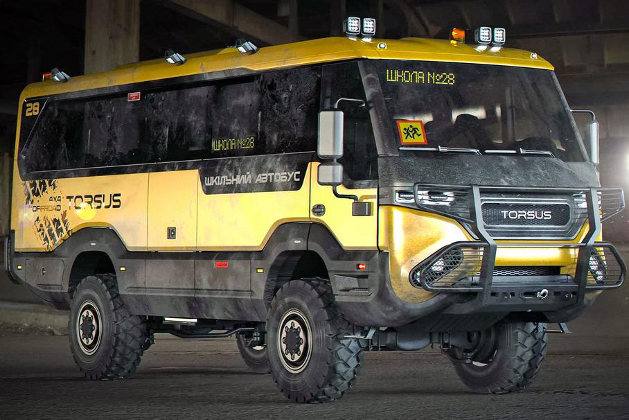 Новый Torsus Praetorian способен доставить детей в школу по самому тяжелому бездорожью. Вместе с тем транспорт удобен в салоне, там предусмотрены полки для рюкзаков. Оборудован внутри 35 сиденьями.