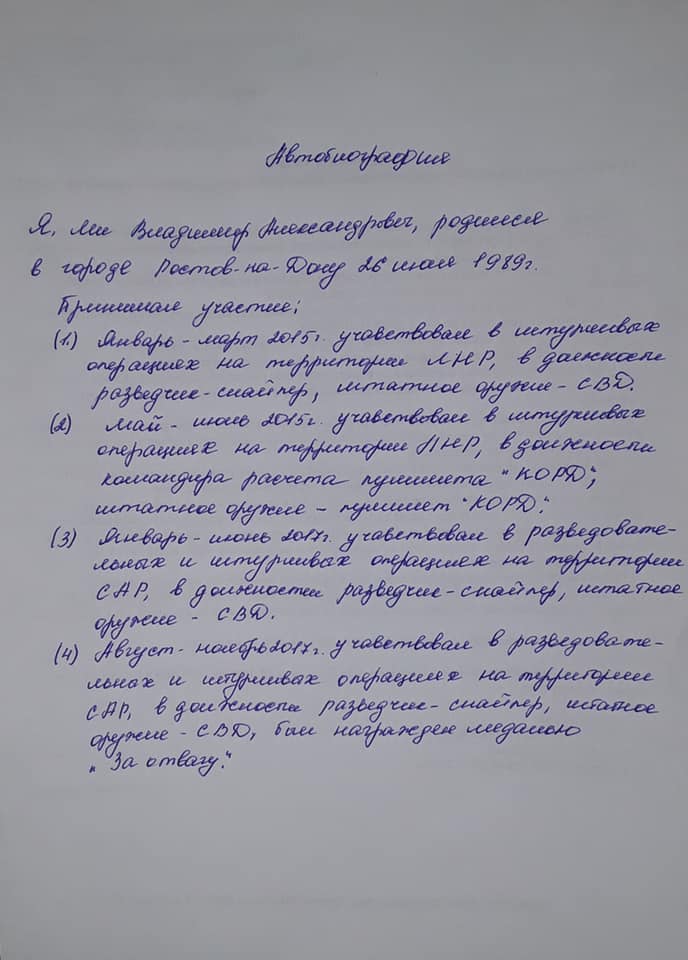 "Владимир Ли из Ростова. Снайпер, наемник, убийца десятков украинских военных. Убивал также в Сирии. Откровенно рассказывает о своих преступлениях. Награжден Путиным "За победу". Должен уже месяц сидеть в украинской тюрьме...", - сообщил Арьев.
