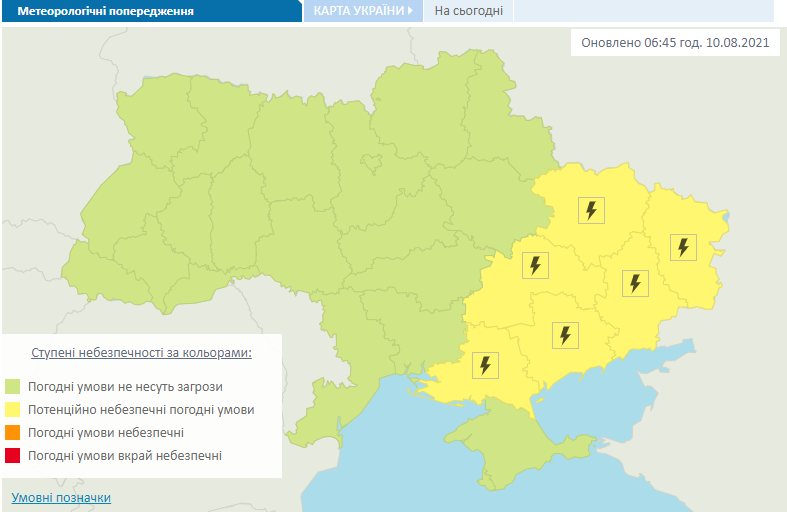 "10 августа в юго-восточной части грозы, в отдельных районах град и шквалы 15-20 м / с (І уровень опасности, желтый). 10 августа в восточных, Сумской, Киевской, Черновицкой областях и в Крыму будет преобладать чрезвычайный уровень пожарной опасности", - предупреждают синоптики.