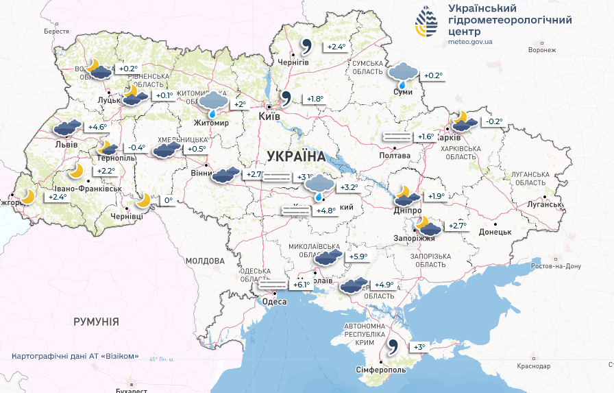 Температура в восточных и Сумской областях ночью 1-7° мороза, днем около нуля, на остальной территории ночью от 2 тепла до 3 градусов мороза. Днем 1-6 градусов тепла, в Одесской области до 9 градусов. В течение 16-17 февраля на западе страны температура подскочит до 7-12° тепла.
