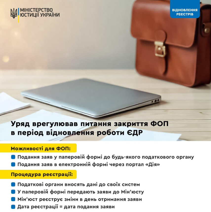 Во вторник, 31 декабря, Кабинет министров Украины согласовал временное решение для закрытия ФЛП во время технических проблем с Единым государственным реестром, не работающим с 19 декабря из-за российской кибератаки.