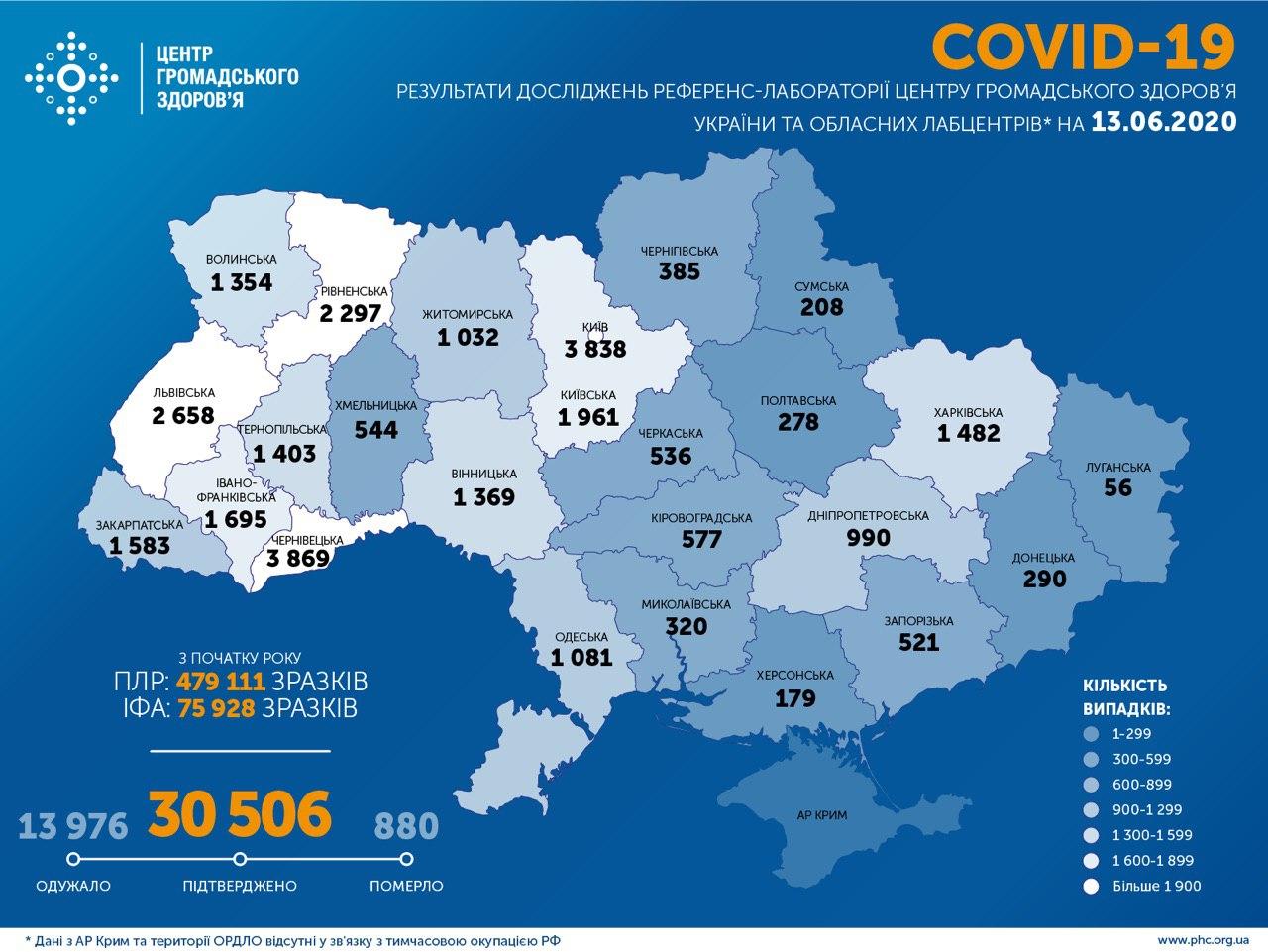 По состоянию на утро субботы, 13 июня, в Украине зафиксировано 30 506 подтвержденных случаев коронавирусной инфекции. Лидерами по количеству больных остаются Черновицкая область (3 869 случаев) и город Киев (3 838 случаев).