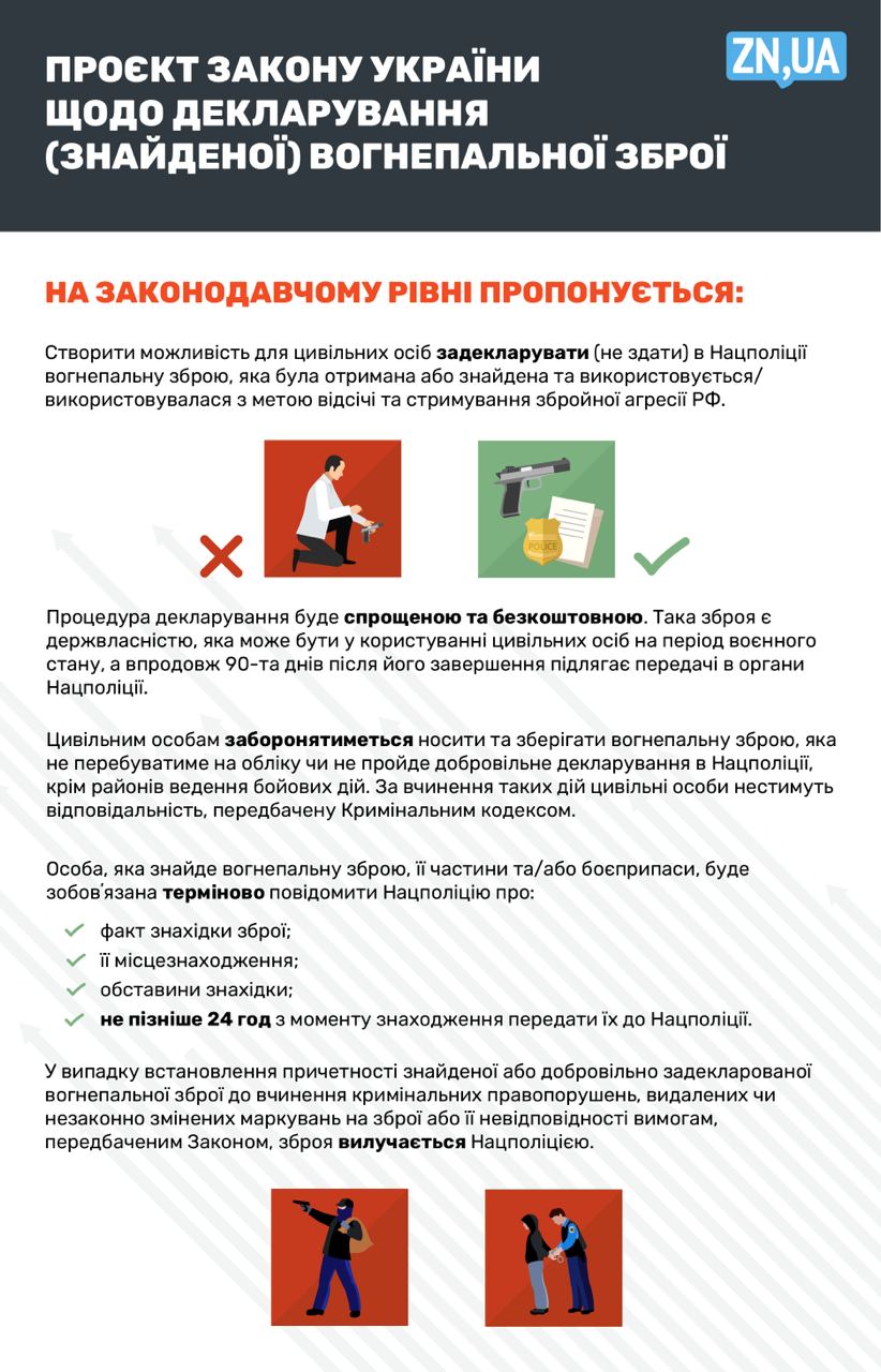 В случае принятия этого закона, украинцы смогут задекларировать огнестрельное оружие, которое было получено или найдено, а позже использовалось для отражения агрессии российских оккупантов. Процедура декларирования должна быть упрощенной и бесплатной. Это оружие - государственная собственность, которая может находиться во владении и использовании гражданских лиц на период военного положения. В течение 90 дней после его завершения оружие подлежит передаче в органы Нацполиции.