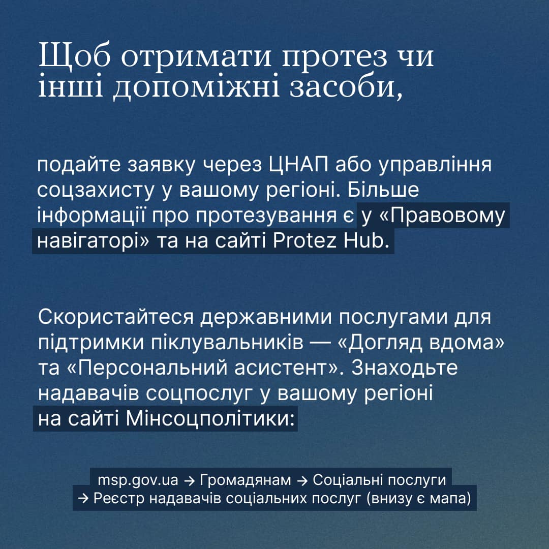Для получения протеза или других вспомогательных средств необходимо подать заявку через ЦНАП или региональное управление соцзащиты. Больше информации о протезировании есть в "Правовом навигаторе" и на сайте Protez Hub.