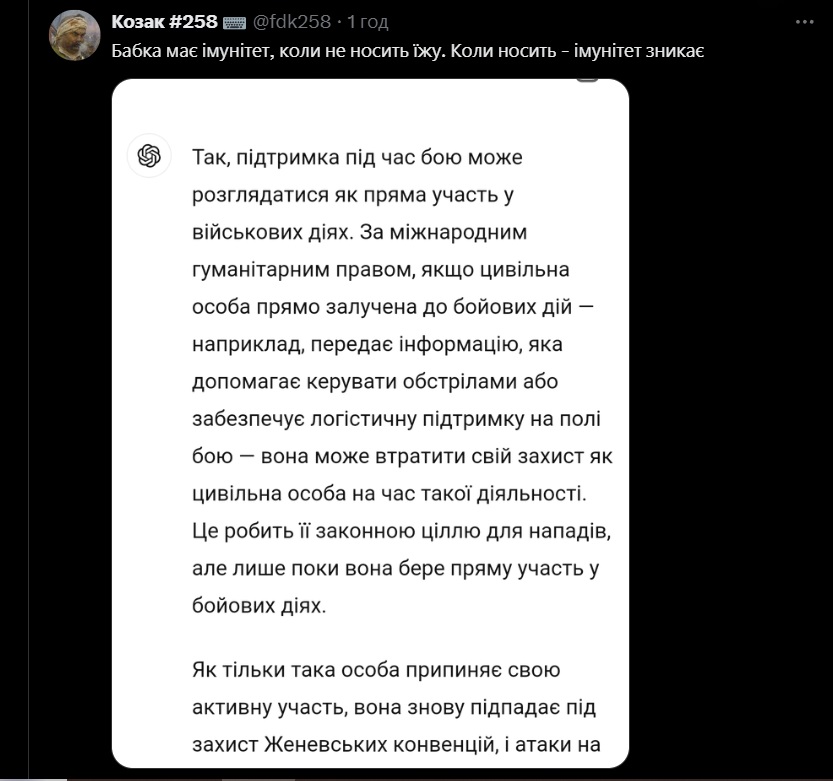 По мнению ИИ-приложения, такие лица в результате своих действий теряют защиту и могут быть законной военной целью, его ответ опубликовал пользователь Козак №258 в Х.