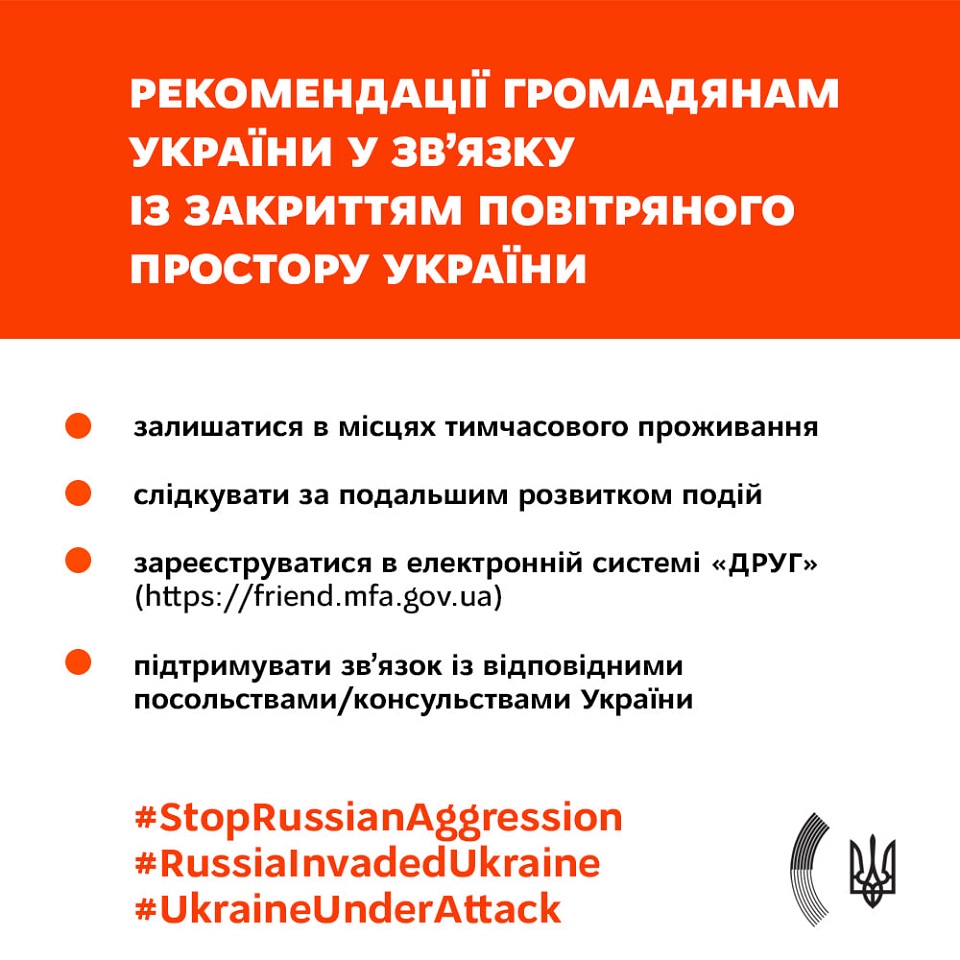 Украинцы, которые не могут вернуться в страну из-за военного вторжения России, должны зарегистрироваться в электронной системе "ДРУГ" и ожидать в местах своего пребывания.