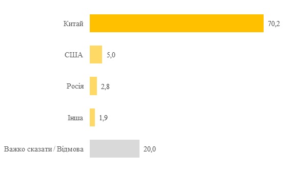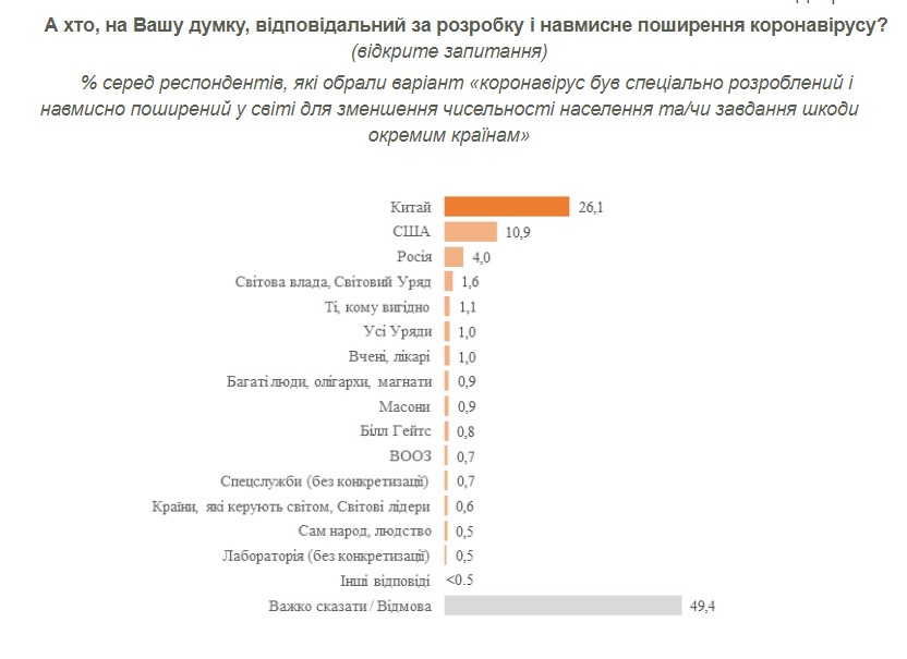 Половина респондентов (49%) затруднились ответить на вопрос. Вместе с тем, 26% считают, что Китай ответственный за разработку и умышленное распространение коронавируса. Далее следуют США (11%) и Россия (2%). Другие ответы назывались реже.