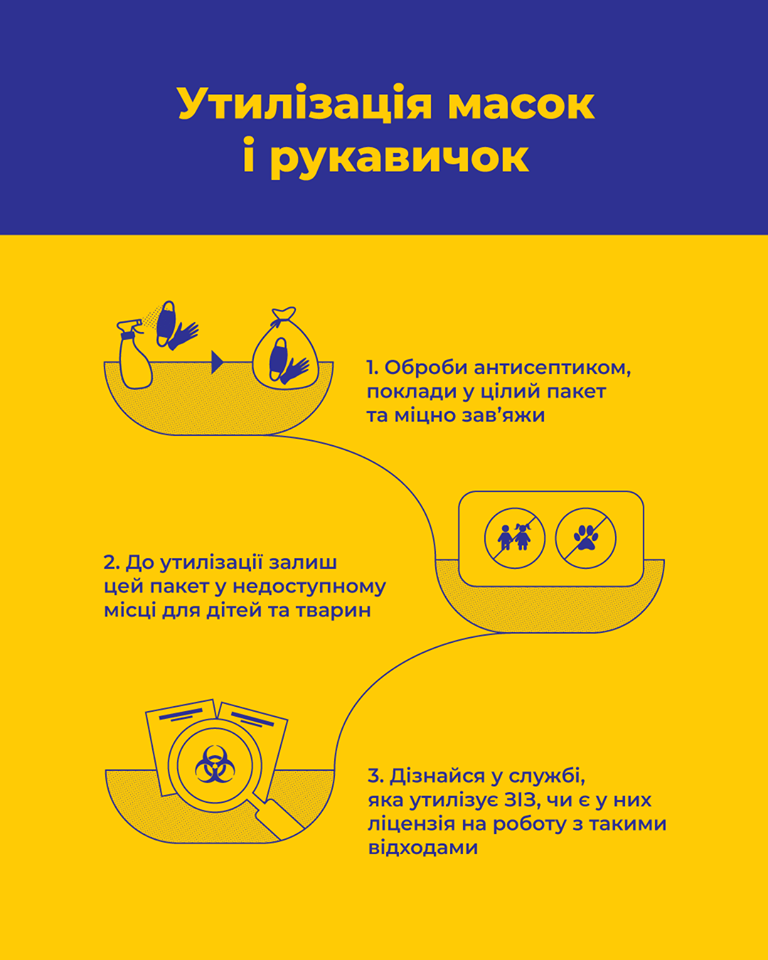 Пресс-служба Минздрава Украины опубликовала схему утилизации масок и перчаток, которые необходимо носить во время карантина.