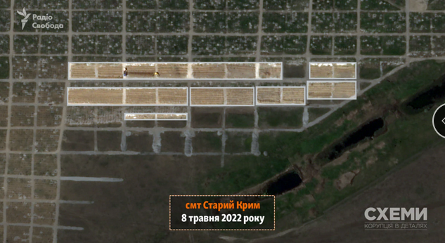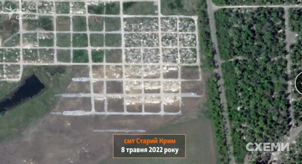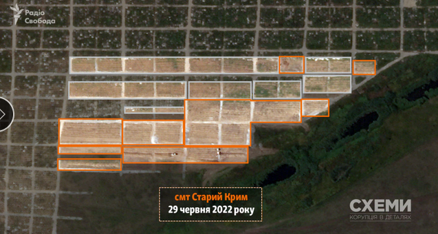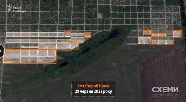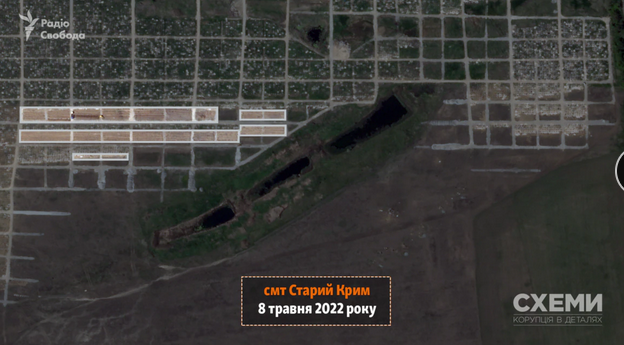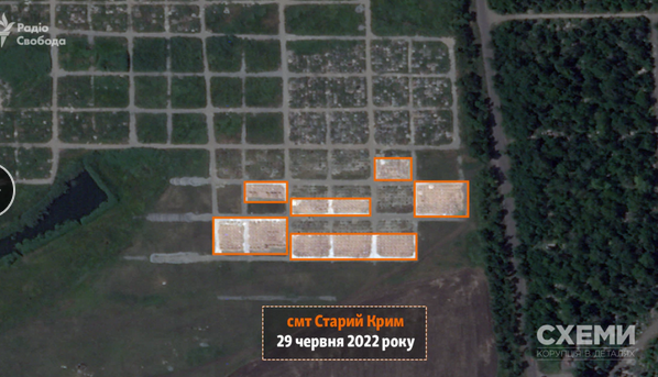 29 июня спутник зафиксировал технику, которая продолжает выкапывать траншеи для захоронения погибших жителей на кладбище возле поселка Старый Крым. По сравнению со снимком за 8 мая места массовых захоронений расширились почти вдвое.