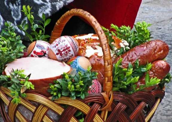 "В корзину клали кулич, пасхальные яйца, колбасу, мясо, сало, ветчину, масло, хрен, соль, иногда пирожки. Также в корзину добавляли освященную веточку вербы, принесенную из церкви в Вербное воскресенье", — рассказывает Громова.