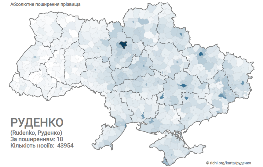 Украинская фамилия Руденко насчитывает 43 954 носителей, поэтому по распространению занимает 18 место.