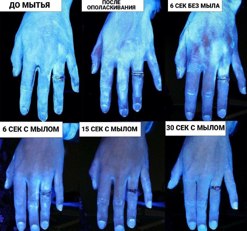 На иллюстрации показано руки "до" и "после" разных видов мытья под светом ультрафиолетовой лампы. Белые зоны - части загрязненные бактериями, темные - без бактерий.