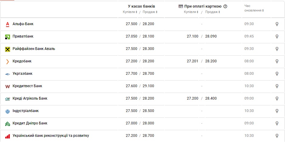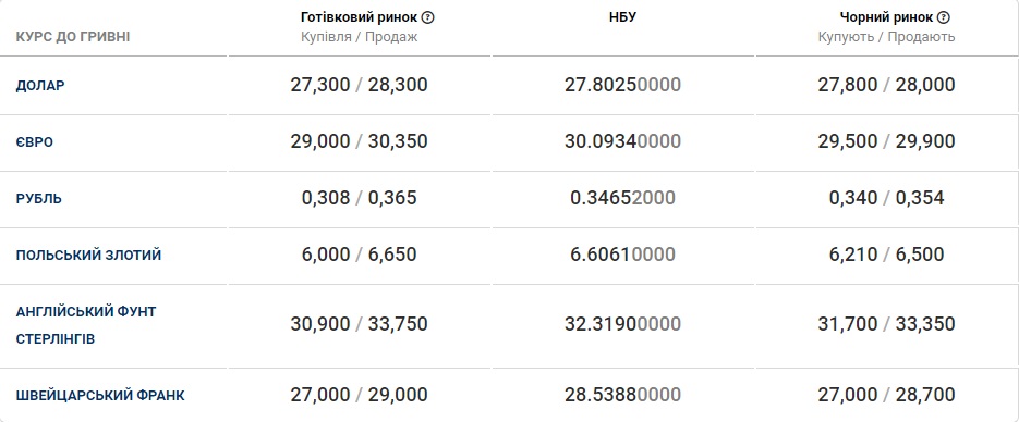 По курсу Нацбанка доллар США сегодня стоит 27,80 гривен, в обменниках - 27,30/28,30 гривен, на черном рынке - 27,80/28,00 гривен.
