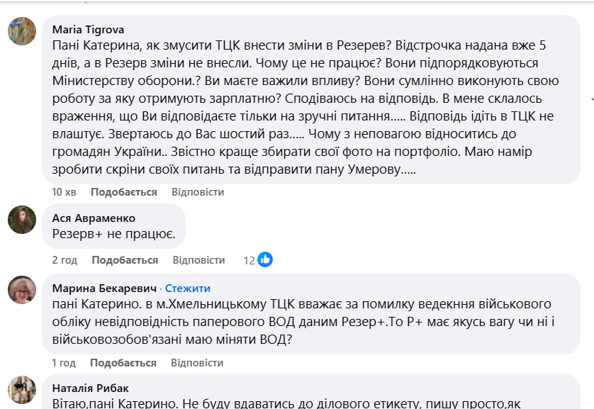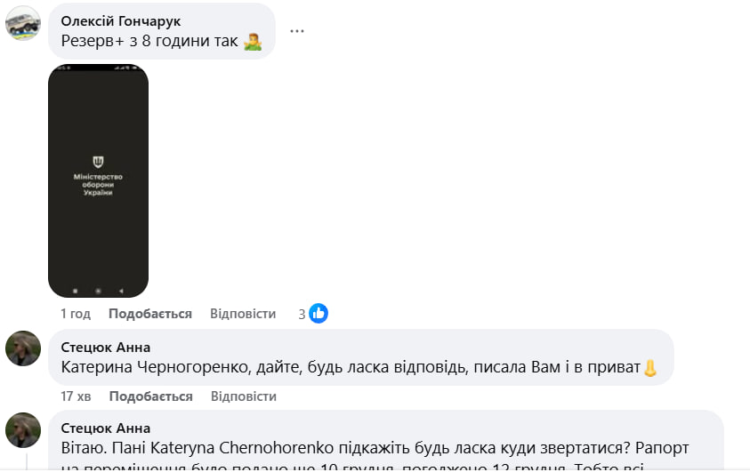 Тем временем под постом заместителя министра обороны Украины Екатерины Черногоренко граждане спрашивают, что же произошло с "Резерв+":