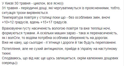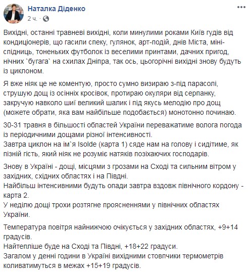 Об этом сообщает синоптик Наталья Диденко на своей Facebook-странице.