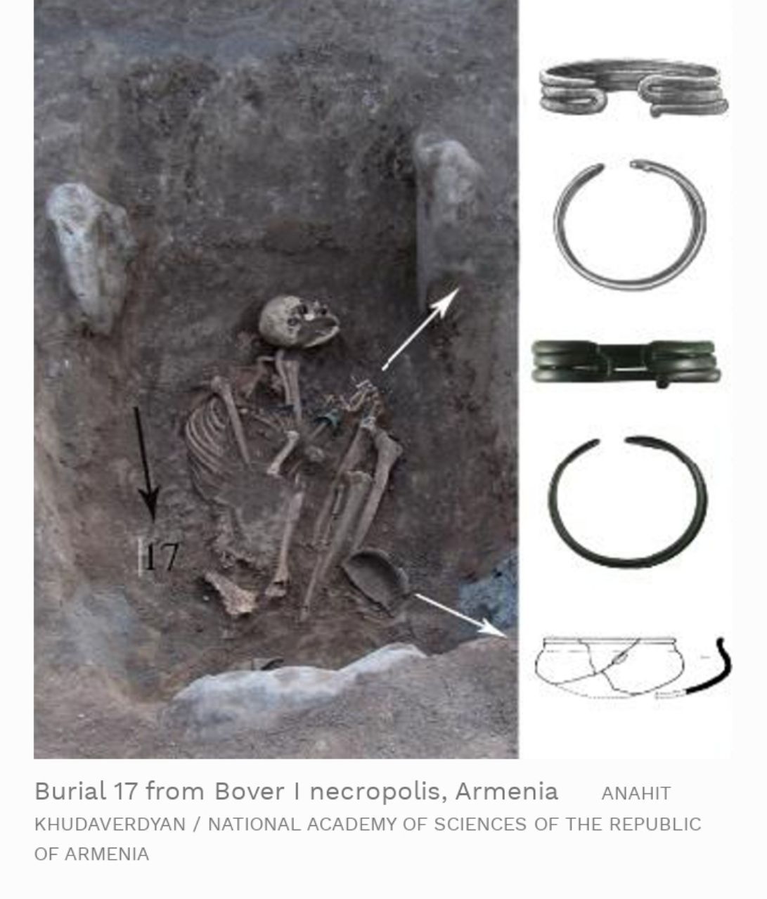 Группа армянских исследователей во главе с Анаит Худавердян с Национальной академии наук нашла захоронения еще в 2017 году. В могиле лежал скелет молодой девушки. На покойной были драгоценности - два браслета и серьги. Рядом лежал керамический сосуд VIII-VI века до н.э.