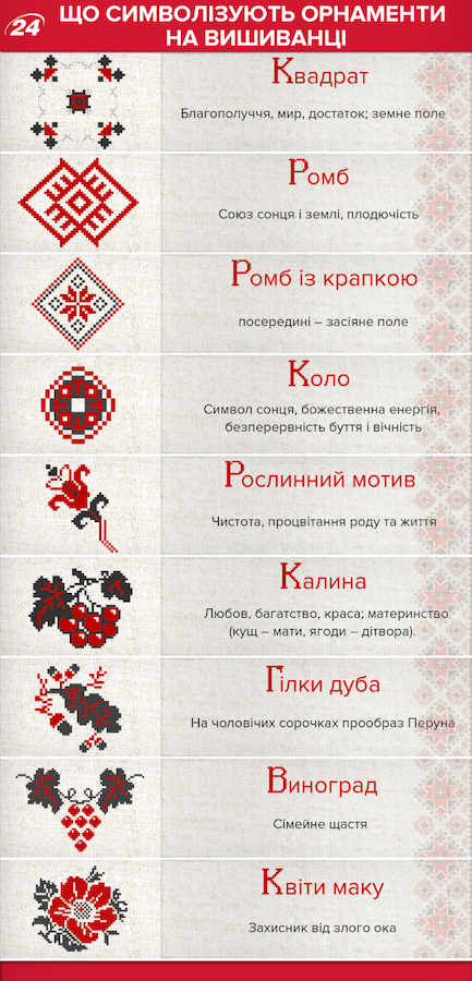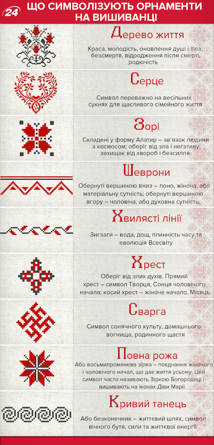 Вышиванка символизирует красоту, здоровье и счастливую судьбу, а также оберегает владельца от всего плохого. Украинцы передают вышиванки из поколения в поколение, поэтому эта вещь еще и сохраняет единство семьи. Специалисты утверждают, что украинский народ закодировал счастье, судьбу, жизнь и свободу в орнаментах вышивки, которые были уникальными для каждого региона Украины, однако имели много общего.