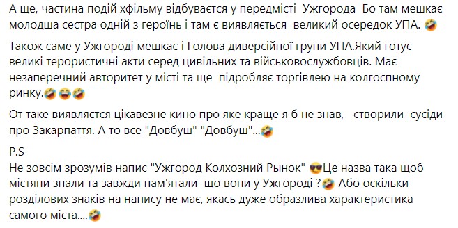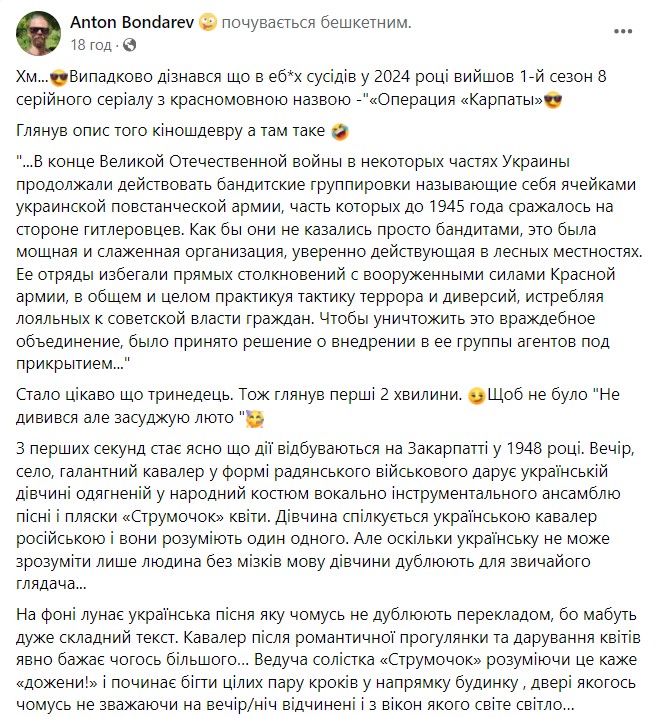 "Вот такое оказывается интересное кино, о котором лучше я бы не знал, создали соседи про Закарпатье. А то все "Довбуш" и "Довбуш", - написал Бондарев.