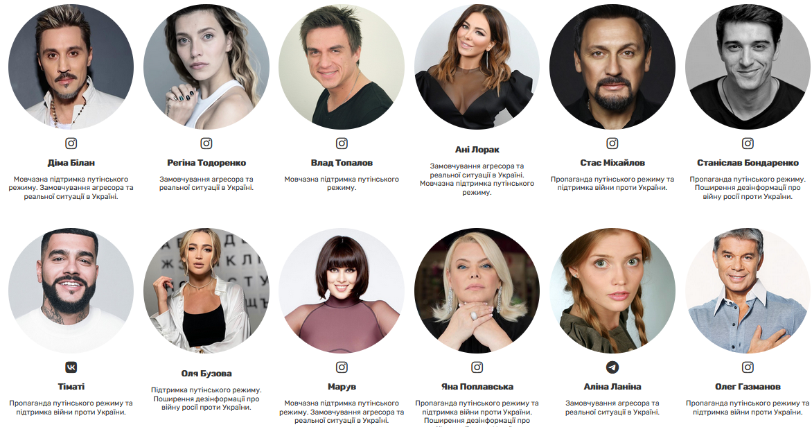 Портал со списком знаменитостей дает понять, кто именно не выступает против войны в Украине или даже прибегает к пропаганде путинского режима.