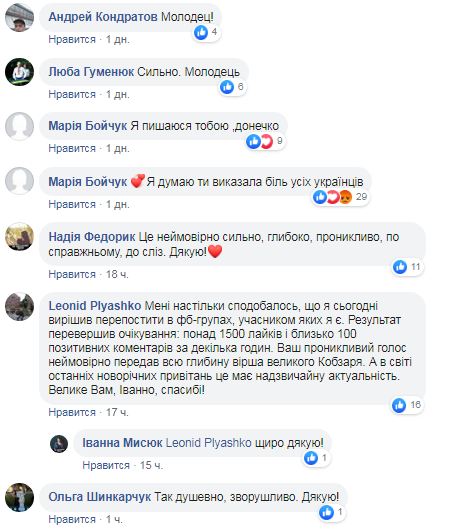 "Мне настолько понравилось, что я сегодня решил перепостить в фб-группах, участником каких я являюсь. Результат превзошел ожидания: более 1500 лайков и порядка 100 положительных комментариев за несколько часов. Ваш проникновенный голос невероятно передал всю глубину стихотворения великого Кобзаря. А в мире последних новогодних поздравлений это имеет чрезвычайную актуальность. Большое Вам, Иванна, спасибо!", "Это невероятно сильно, глубоко, проникновенно, по-настоящему, до слез", "Я думаю ты выдала боль всех украинцев", - пишут в комментариях.