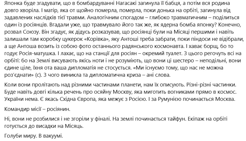 Режиссерка Ирина Цилык написала, что у нее также от романа "глаз дергался": "А смотри же, именно это и победило. Российский капитан спасет человечество, все высадятся на Луну, поедят борща, и как-то оно будет".