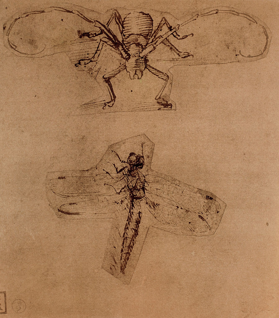 Леонардо да Винчи в своих зарисовках показал, что, когда передние крылья стрекозы поднимаются, задние опускаются – это движение происходит очень быстро.