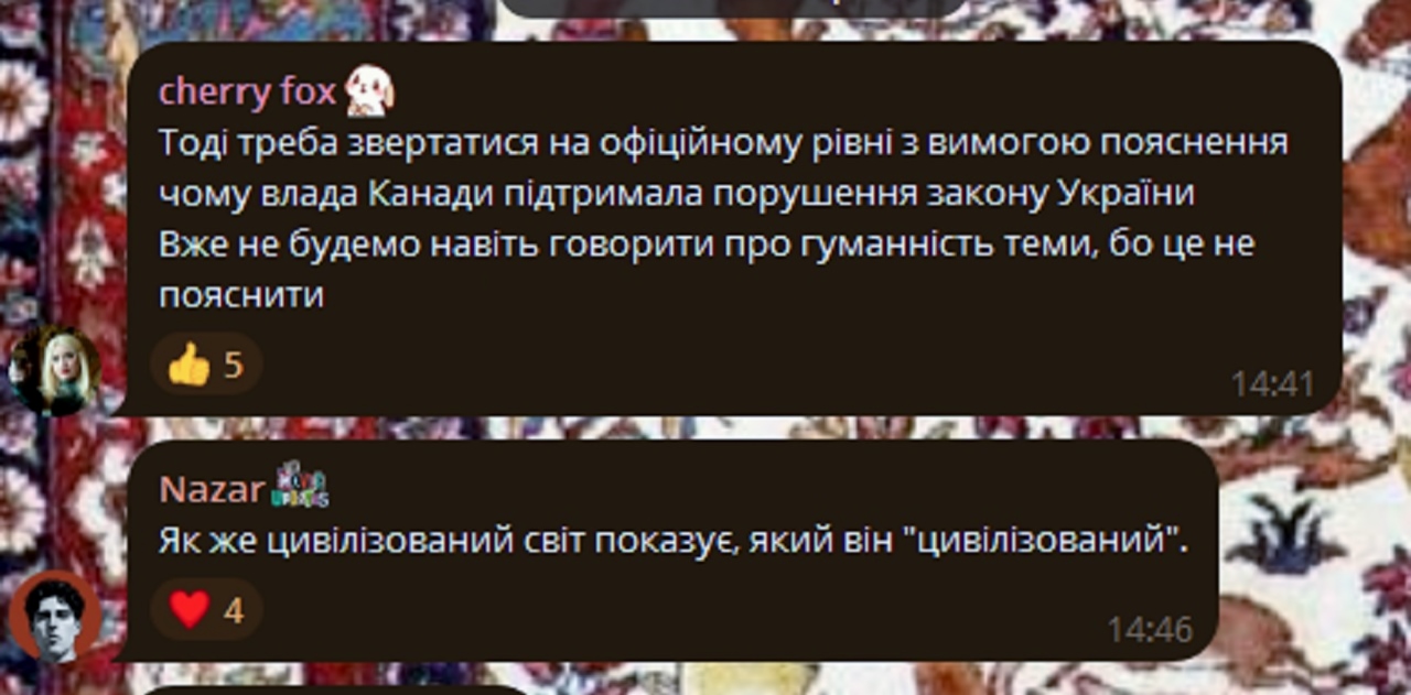 В связи с этим пользователи соцсетей призвали украинскую власть обратиться к Канаде с официальным запросом, почему страна фактически прибегла к соучастию в распространении нарративов страны-агрессорки. Также украинцы в очередной раз выразили разочарование в западных партнерах из-за терпимости их к россиянам.