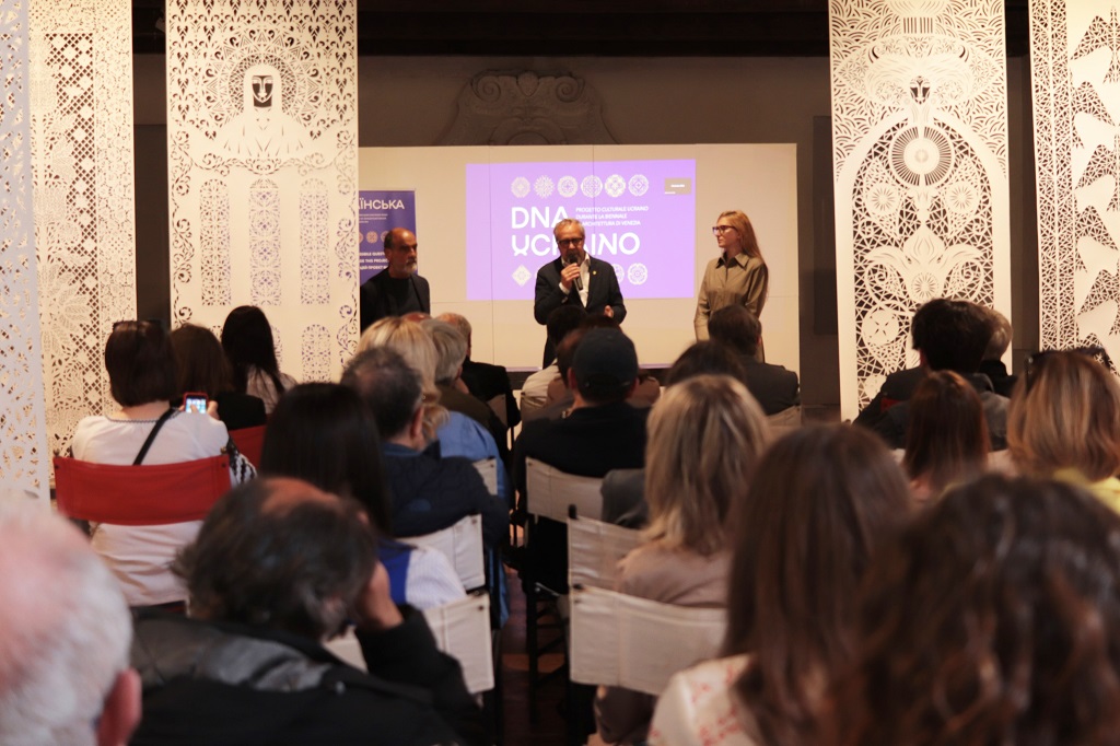 Ранее сообщество украинских архитекторов, дизайнеров и художников зарегистрировалось на "Лаборатории будущего", которая является темой Биеннале. Ассоциация дизайнеров Design4Ukraine с Роберто Бьянкони объединила усилия с Национальным союзом архитекторов Украины, задача проекта – показать культурный синтез, включающий в себя архитектуру, традиционное ремесло, историю, музыку, искусство и действительность. Кураторы проекта: Роберто Бьянкони, Анна Манако, Анастасия Белецкая, Анна Кирий, Ольга Нешта и Сана Моро - куратор проекта "Ризома". Коллектив художниц составлен из дизайнеров и художниц Орнеллы Остапенко, Дарьи Алешкиной и Дианы Бильченко, они создали визуальную композицию "Украинская ДНК", объединенную концепцией, которая основывается на исследовании Орнеллы Остапенко.