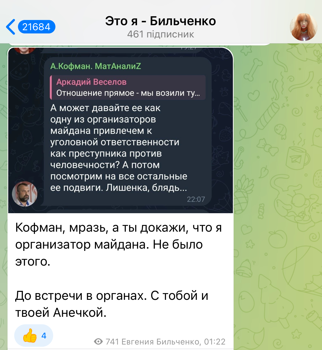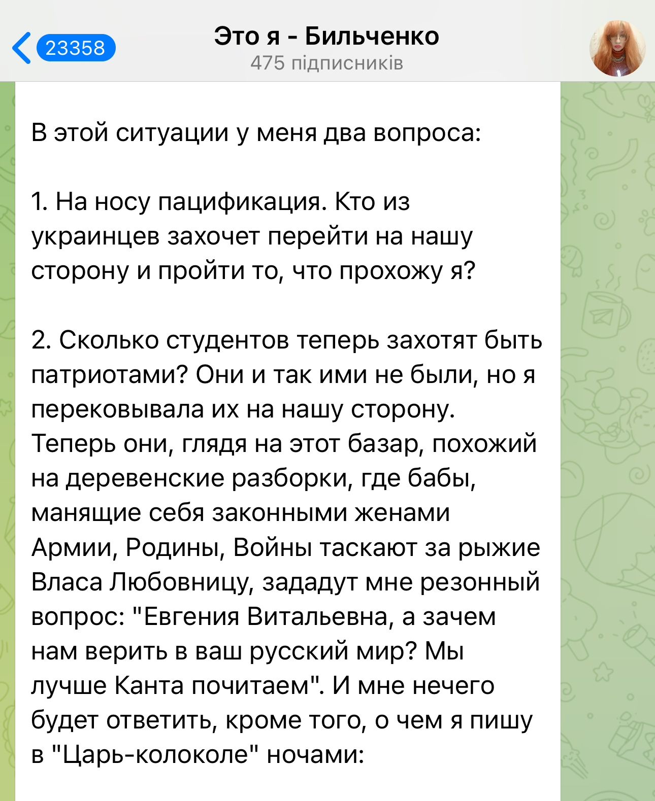 Он отметил, что профессор Бильченко, которая в свое время предала Украину, теперь сетует на то, что мечтала вовсе не о таком "русском мире".
