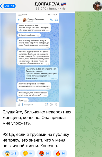 "Все это причинило ей нестерпимые страдания и мучения, и она стала писать горькие посты о том, что ее в России растоптали как волонтера и как поэта. Бильченко пожаловалась, что даже отреклась от своих биологических родителей в Киеве, прям как при Сталине, но не помогло даже и это. Российские патриоты так и не приняли ее за свою. Очень поучительная история для коллаборантов...", - добавил журналист.