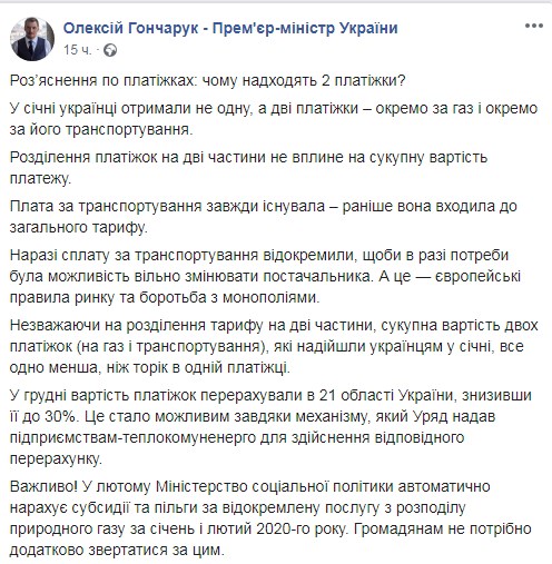 Гончарук добавил, что, несмотря на разделение тарифа на две части, совокупная стоимость двух платежек (на газ и транспортировку), которые поступили украинцам в январе, все равно меньше, чем в прошлом году в одной платежке.