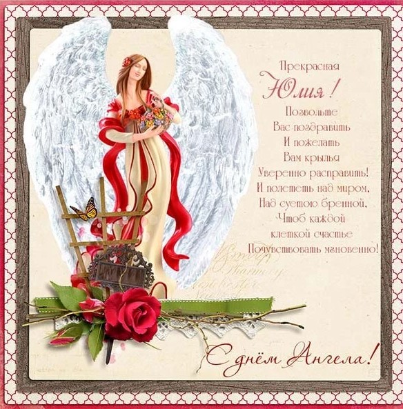 Дорогая Юлия, поздравляю тебя с днем ангела. Желаю тебе быть счастливой. Желаю здоровья, любви и успехов в работе. Того, что ты и сама себе желаешь, но в двойном, а то и тройном размере.