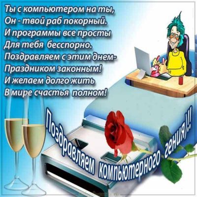 Дорогой наш компьютерный ас, поздравляем тебя с твоим профессиональным праздником! Мы желаем тебе надежной техники, которая никогда не подводит, новых технологий, благодаря которым твоя жизнь станет еще интереснее, и, конечно, благодарных пользователей, которым ты помогаешь каждый день!