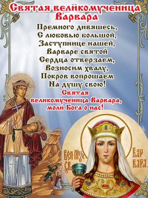 Поздравляю с Днем святой Варвары и от души желаю крепкой веры и благих деяний, верных целей и светлой надежды, чистой любви и искреннего уважения, доброй помощи небес и истинного счастья жизни.
