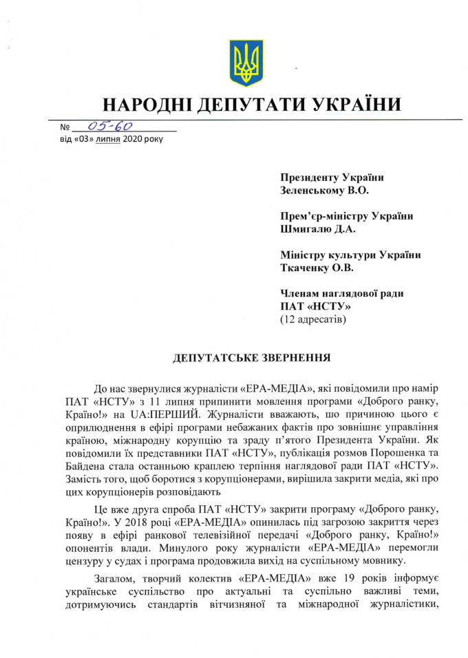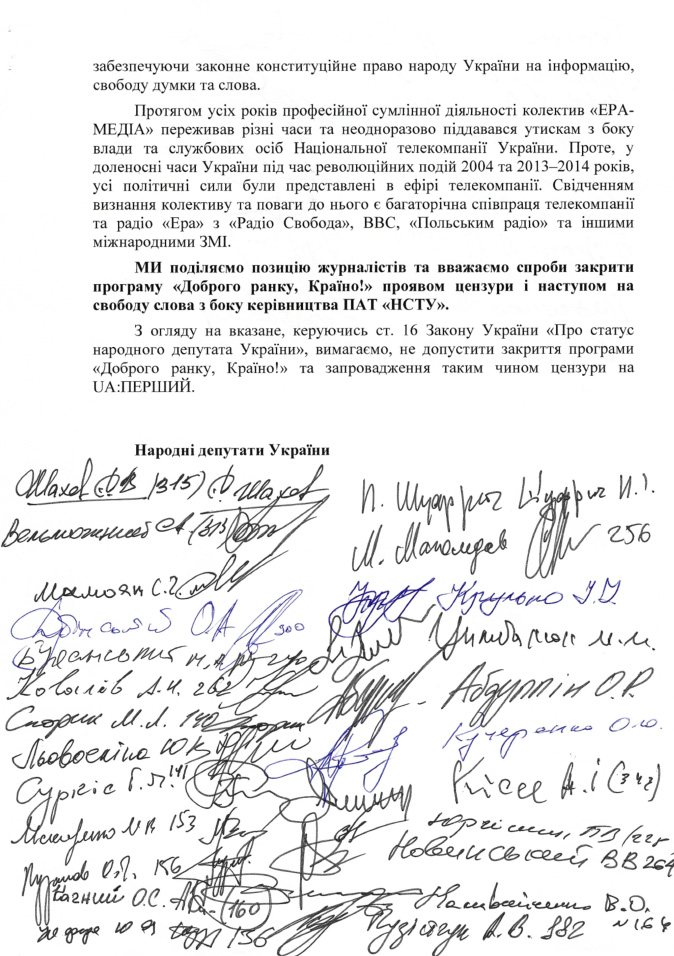 "Руководствуясь ст. 16 Закона Украины "О статусе народного депутата Украины", требуем не допустить закрытия программы "Доброго ранку, Країно!" и введения таким образом цензуры на UA:Перший", – говорится в обращении.