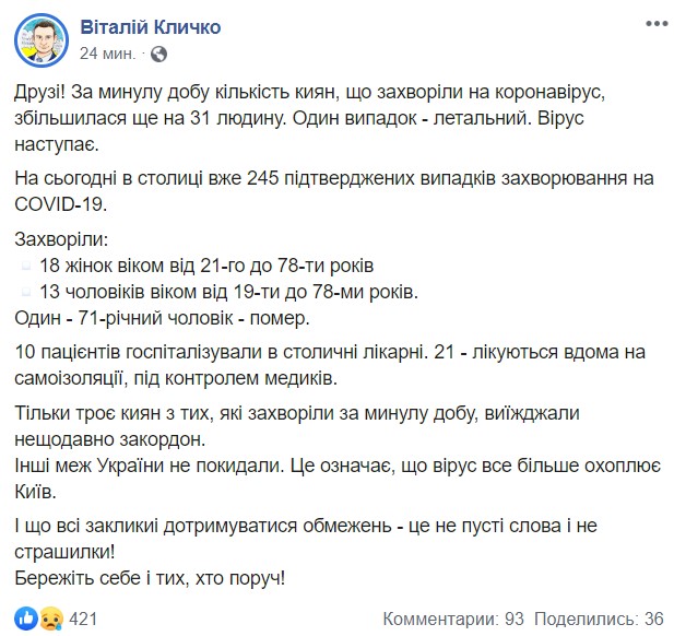 Кличко пишет, что за последние сутки 10 пациентов госпитализировали в столичные больницы. 21 - лечатся дома на самоизоляции, под контролем медиков.