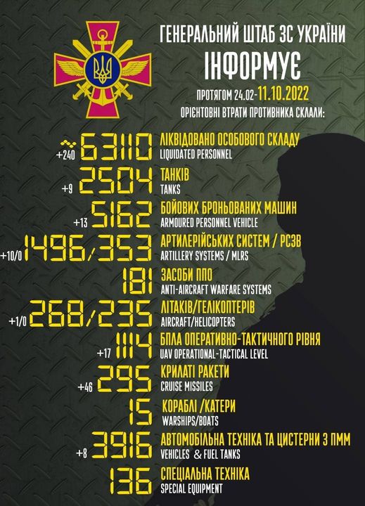 Общие боевые потери противника с 24.02 по 11.10 ориентировочно составили: