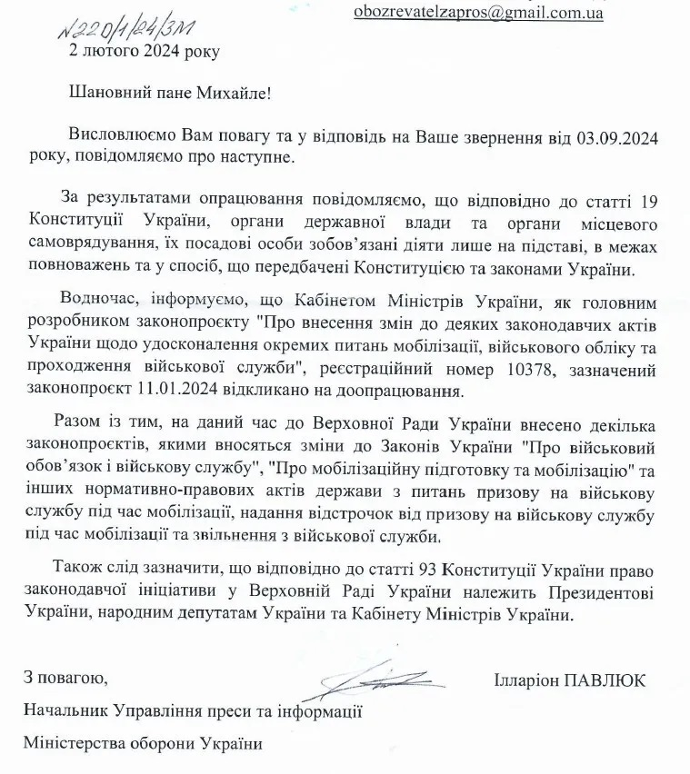 В ответе указано, что КМУ может действовать только в пределах тех полномочий, которые предусмотрены Конституцией и законами Украины. Далее в ведомстве подчеркнули, что именно правительство было главным разработчиком законопроекта №10378 по усовершенствованию мобилизации, но его отозвали на доработку.