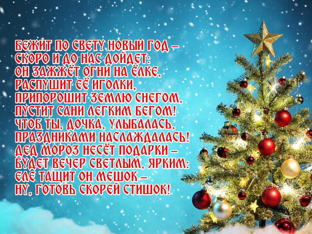 На пороге волшебный день. Наступает Новый год! Пусть легко сбываются мечты! Пусть снежинки окружат тебя заботой и счастьем! Желаю светлых людей на твоем пути. Любви, уютного дома, новогодних подарков, смеха и радости!