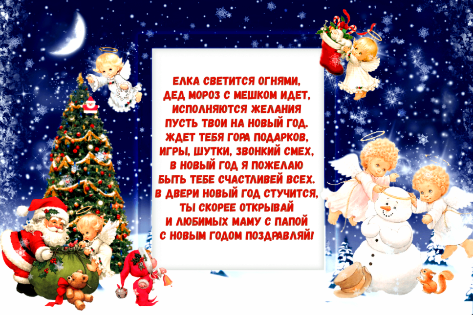 Милое дитя, с Новым годом тебя! Пусть все твои мечты, твои детские задумки свершатся в этот наступающий год. Пусть все дни будут загадочными и волшебными. Пусть смекалка, удача и везение сопутствуют на каждом твоем шагу. Пусть целое море цветов ожидают тебя после каждого твоего достижения. Близких и верных подруг и друзей, пусть все подарки желаемые ждут тебя под елкой.