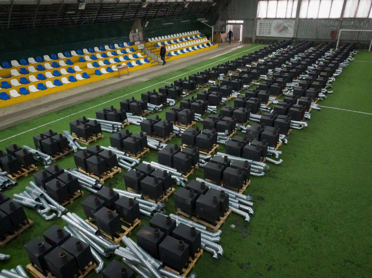 буржуйки в спорткомплексе неподалеку от Полтавы. Печи для обогрева заняли все футбольное поле площадью более 900 м2.