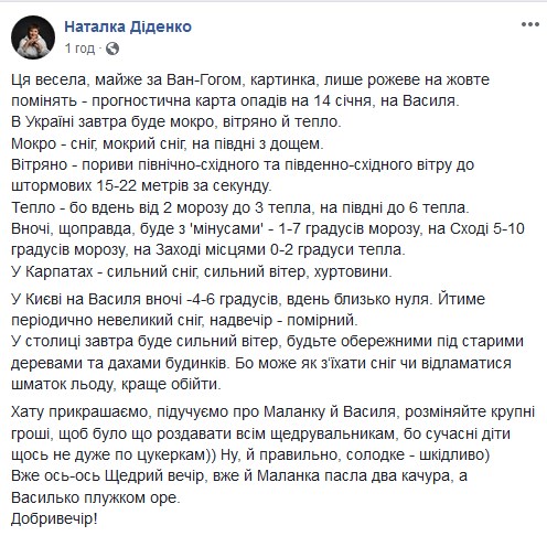 Об этом на своей странице в Facebook сообщила синоптик Наталка Диденко.