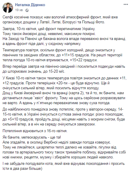 Об этом в Facebook сообщает синоптик Наталка Диденко.
