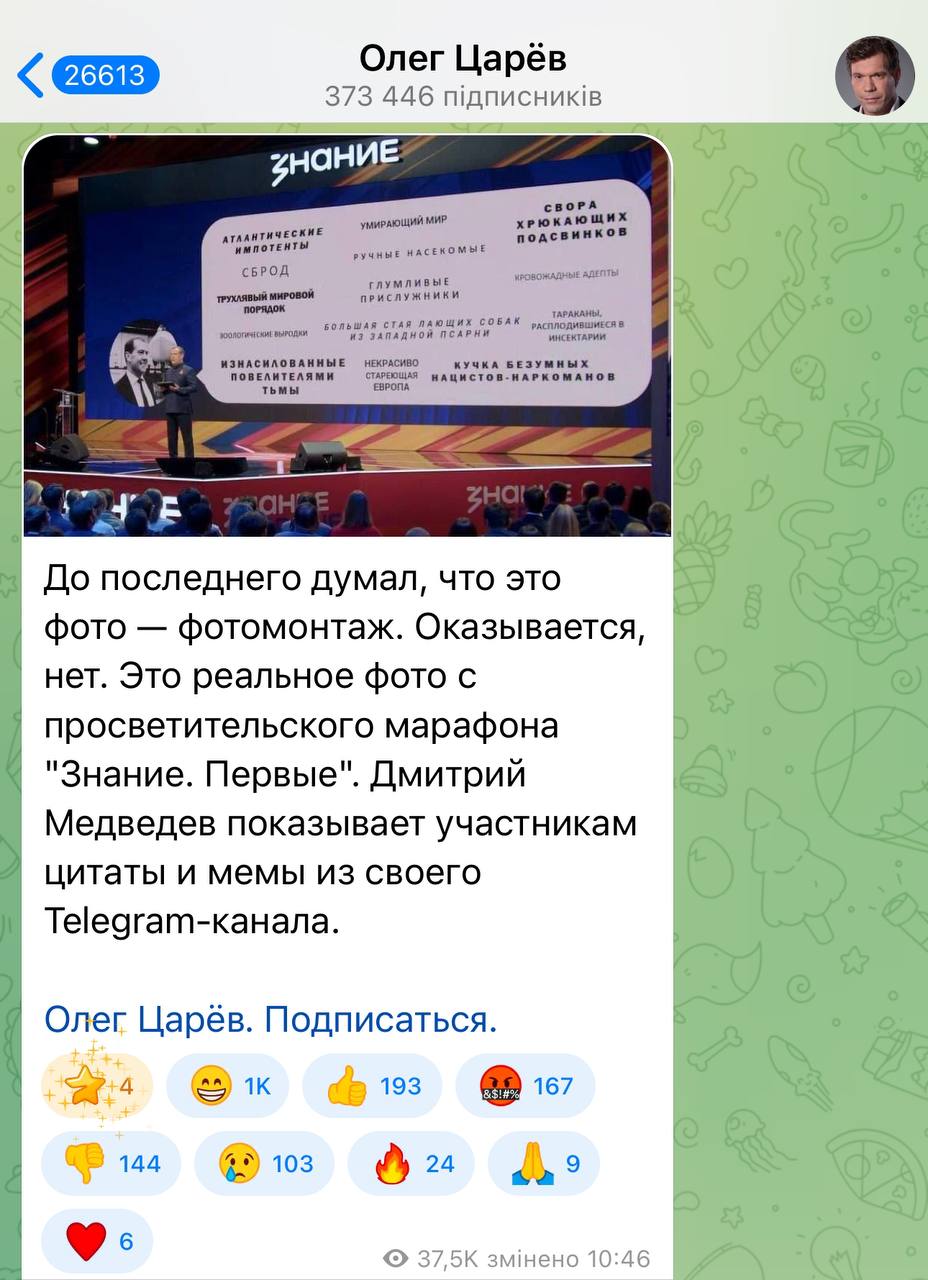 "Тот момент, когда от безумия Медведева ох***ел даже Олег Царев. Нет, Царев, это не фотомонтаж. Это мракобесие, которое ты сам поддерживаешь и пытаешься навязать Украине", - написал Казанский.