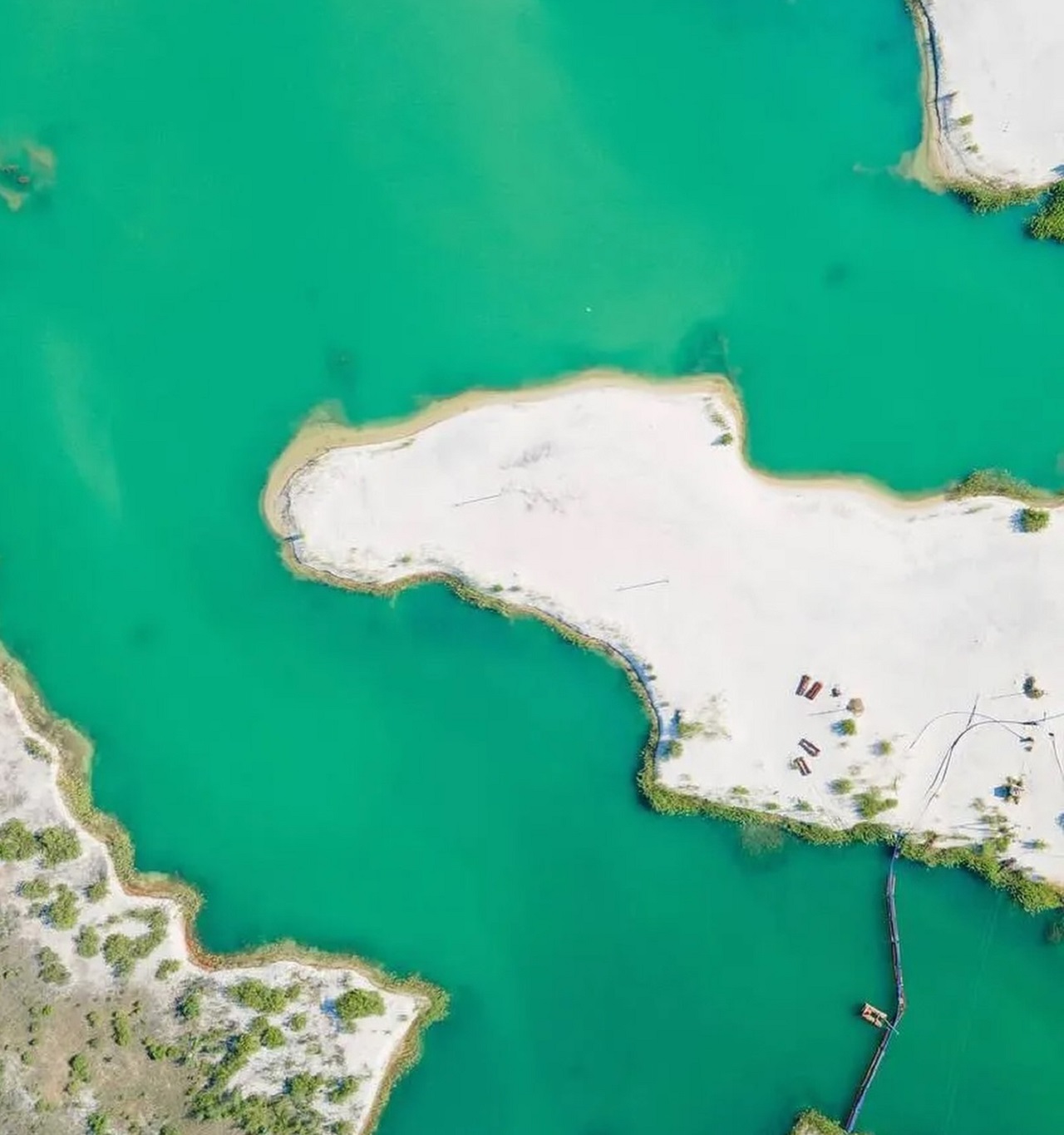 В результате этой работы образовались дюны с белым мелким песком и чистыми озерами – вода из подземных источников заполнила карьер, и выглядит она невероятно прозрачной и не цветет.