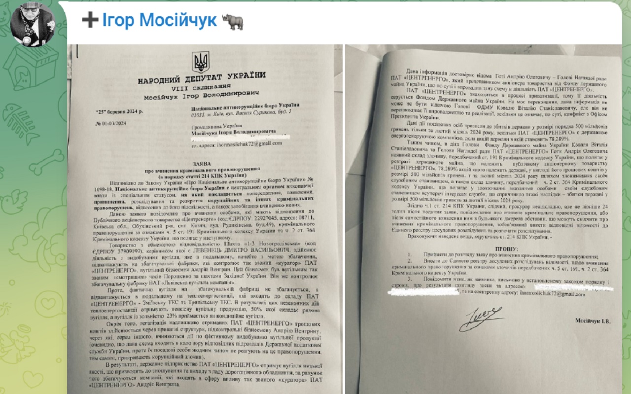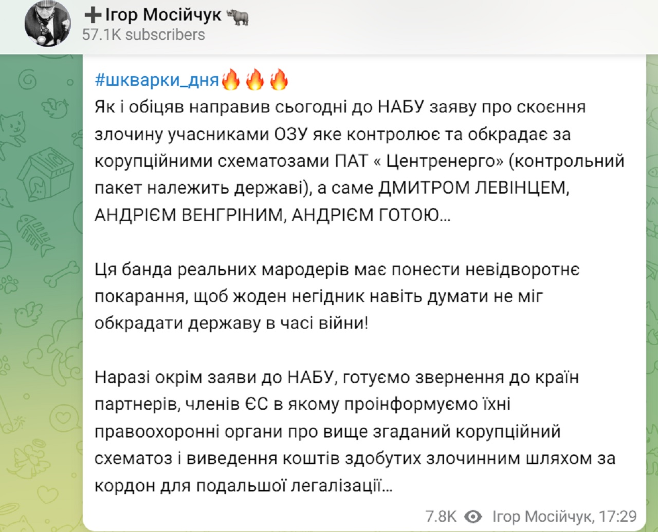"Направил сегодня в НАБУ заявление о совершении преступления участниками ОПГ, которое контролирует и обворовывает по коррупционным схематозам ПАО "Центрэнерго" (контрольный пакет принадлежит государству), а именно ДМИТРИЕМ ЛЕВИНЦОМ, АНДРИЕМ ВЕНГРИНЫМ, АНДРЕЕМ ГОТОЙ... Кроме заявлений в НАБУ, готовим обращение к странам-партнерам, членам ЕС, в котором проинформируем их правоохранительные органы о вышеупомянутом коррупционном схематозе и выводе средств полученных преступным путем за границу для дальнейшей легализации", – пишет Мосийчук.