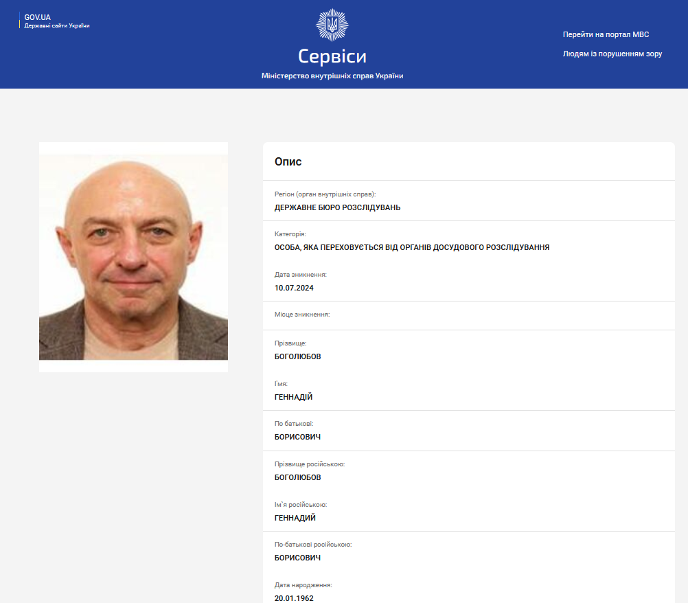 Как отмечается на портале, Боголюбова разыскивают как "лицо, которое скрывается от органов досудебного расследования". Указана дата исчезновения бизнесмена – 10 июля 2024 года.