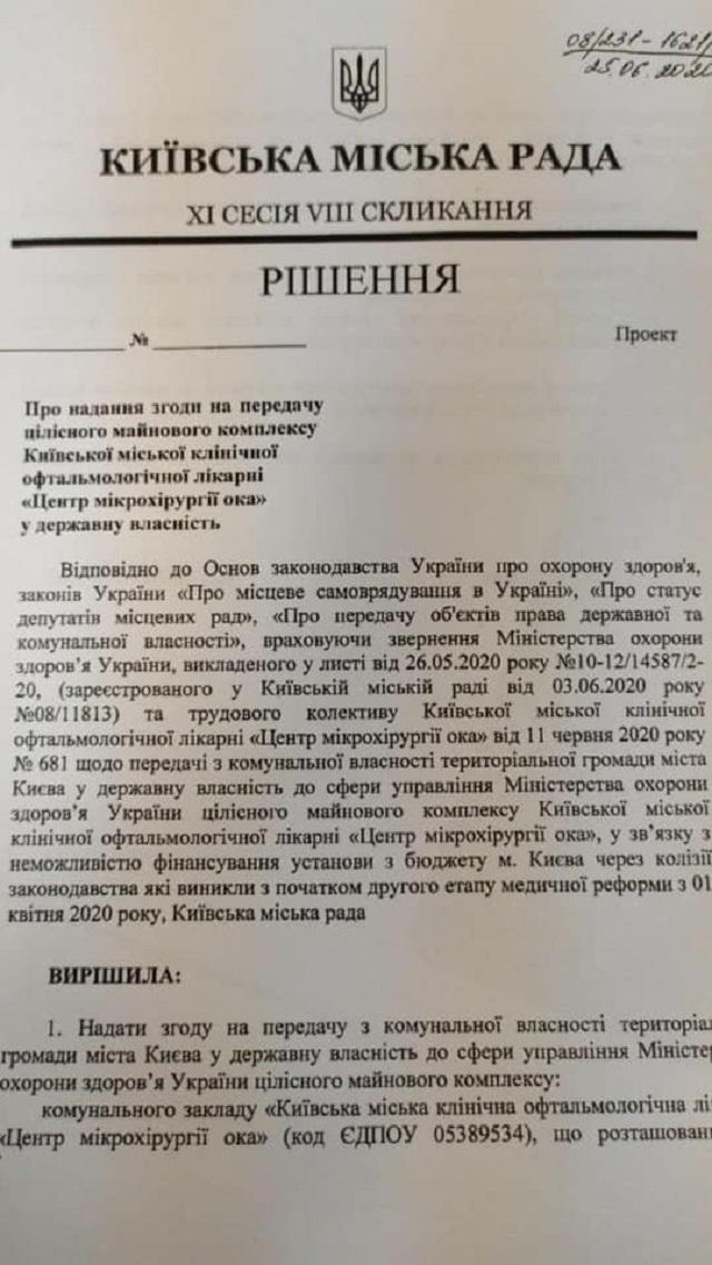 В Киевраде разработан проект постановления о передаче в управление Министерства здравоохранения Киевской городской клинической офтальмологической больницы "Центр микрохирургии глаза" и Киевского городского центра репродуктивной и перинатальной медицины.